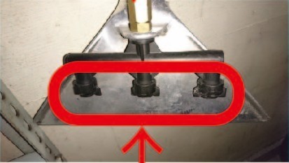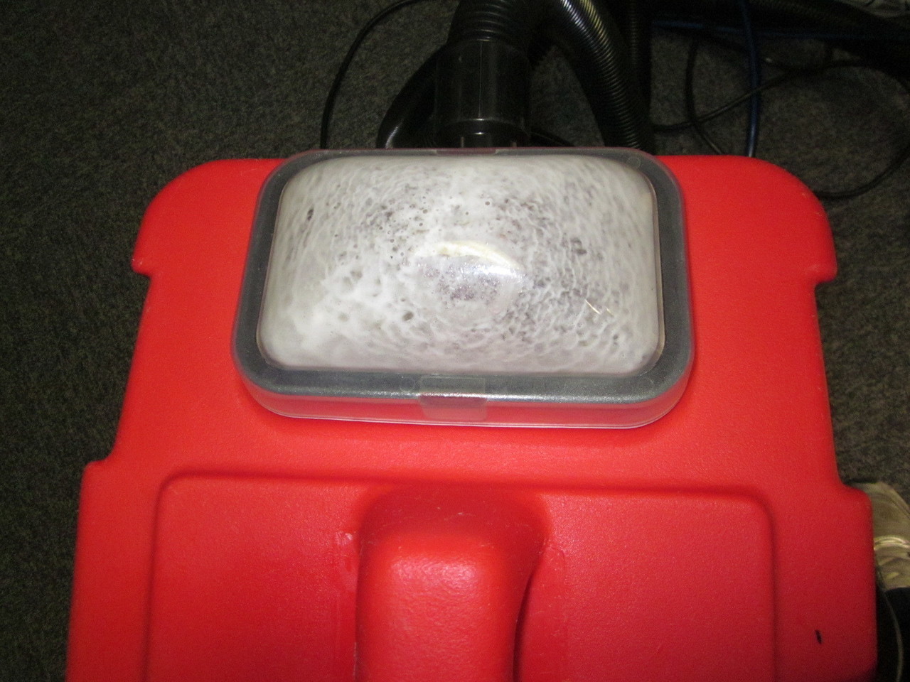 機械洗浄の後の汚れをエクストラクターという機械で吸い取ります。ただ吸い取るだけでなく、吸い取り口の手前にあるスプレーでリンス剤を散布してすすぎながら吸い取ります。(下写真左)吸い取るときに汚水を吸い取る量ができるだけ多くなるようにノズルの角度を調整しながら吸い取ります。